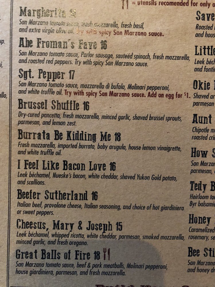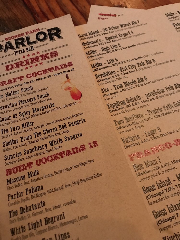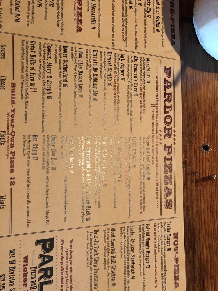 Introducing the menu at Parlor Pizza Bar - Wicker Park, located at 1824 West Division St Chicago, IL 60622, offers a diverse selection of dishes beyond just pizza. The Antipasto Chopped Salad, Caesar Salad, and Kale Cobb Salad provide refreshing options before indulging in their delicious pizzas. Noteworthy pre-pizza choices include the Balsamic Glazed Fried Mozzarella and Glazed Brussels Sprouts for unique appetizer experiences. The menu also features non-pizza options like the Parlor Chicken Sandwich and Rustic Parlor Chicken Pita for varied palates. Customers rave about the food quality, attentive service, and vibrant atmosphere of Parlor Pizza Bar. Whether you're looking for a casual lunch or a group celebration, Parlor Pizza Bar is a must-visit spot in Wicker Park for a memorable dining experience.